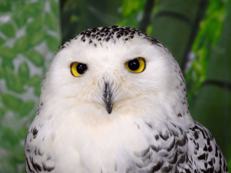 真っ白な羽毛が特徴の大型フクロウです。